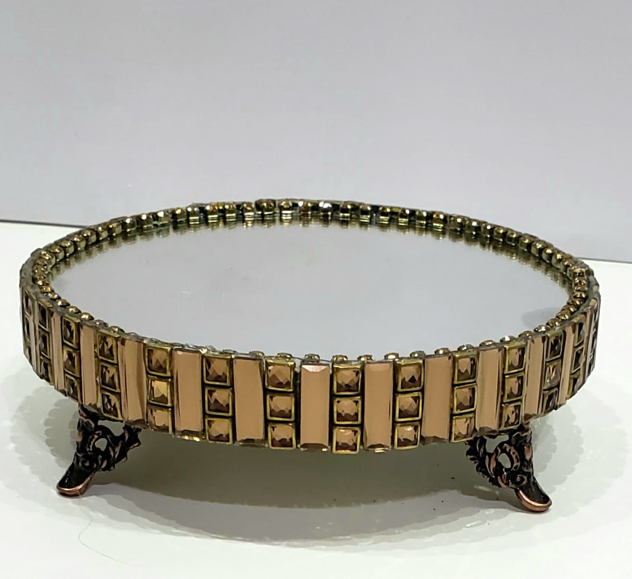 Bandeja espelhada feito artesanalmente, com detalhes em strass e pedrarias, na cor bronze e pès de metal na cor rosé envelhecido,